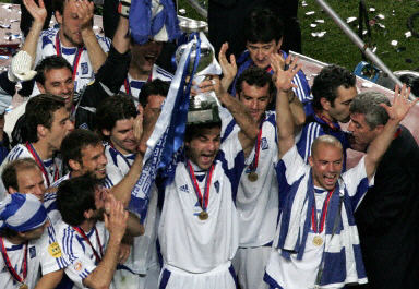 中新網(wǎng)7月5日電 在北京時間今天(5日)凌晨結(jié)束的2004年歐洲足球錦標賽決賽中,希臘隊憑借前鋒查里斯特亞斯的入球以1:0擊敗東道主葡萄牙隊奪得冠軍。