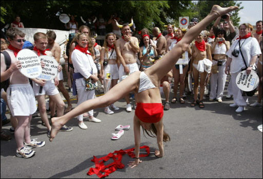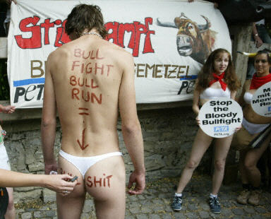 這些動物保護者本打算像往年一樣組織裸體游行,但由于今年西班牙政府未予批準,他們只能進行了半裸游行。