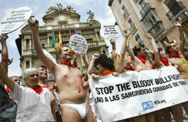 示威者們指出,為了吸引成千上萬的游客,潘普洛納每年都殘忍地對待大批公牛,并在斗牛前對公牛進行針刺、鞭打等各種折磨以令其害怕,而這些虐待動物的行為都是應該被制止的。