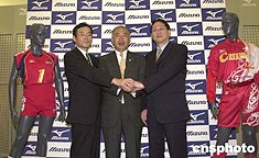 日本體育用品代表企業美津濃7月6日在東京展示贊助中國女排(圖左)與中國女壘(圖右)參加雅典奧運的比賽用服,并宣布將在北京奧運會之前的四年內加大投資中國的力度,爭取占得更大市場份額。作者:王健