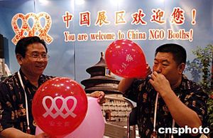 中國民營企業首次參加世界艾滋病大會,圖為中國最大的民營安全套生產企業——安琪膠業的董事長和總經理在布置展位。第十五世界艾滋病大會七月十一日在泰國首都曼谷開幕。來自一百六十個國家的領導人、科學家、社會活動家以及艾滋病患者,共計一萬五千多名代表出席了大會。中新社記者:曾利明