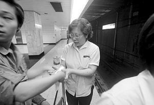 地鐵工作人員盛麗敏(中)敲碎玻璃按緊急停車按鈕,手受了傷。