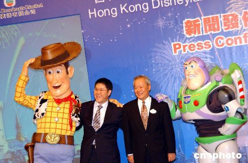 香港迪斯尼樂園及電視廣播有限公司7月14日聯合舉行新聞發布會,宣布推出一系列迪斯尼動畫及電影,圖為迪斯尼電影卡通人物巴斯光年與胡迪出場助興。作者:洪少葵