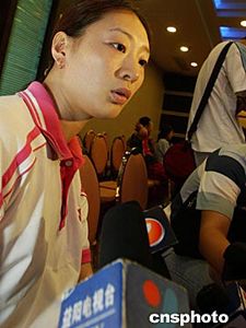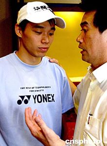 十四日,中國國家體育總局在湖南益陽市宣布中國羽毛球隊參加雅典奧運會的五個單項參賽隊員名單和替補隊員名單,上屆奧運會羽毛球銅牌得主、世界冠軍夏煊(xuan火加宣)澤列為替補隊員,可能無緣參加這一體育盛會。圖為國家體育總局乒羽中心主任劉鳳巖與夏煊(xuan火加宣)澤在一起。中新社記者:宋吉河