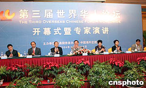 由國務院僑辦和中國海外交流協會主辦的《第三屆世界華人論壇》七月十五日在北京召開。論壇以“建立中國----東盟自由貿易區:華商面臨的挑戰、機遇和對策”為主題,邀請近百名海內外企業家、政府官員、專家、學者相聚一堂,共謀發展。中新社記者:史利