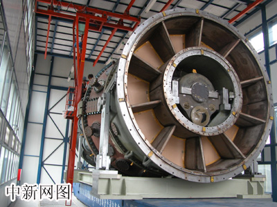 “網上河北行”采風團參觀訪問秦皇島經濟技術開發區中的哈爾濱動力設備股份有限公司,該公司展示了和美國GE公司組裝成功的中國第一臺大功率燃氣式發電機組,價值逾3億元人民幣。(秦欣攝)  中國第一臺大功率燃氣式發電機組,價值逾3億元人民幣。(劉鋼虎攝)