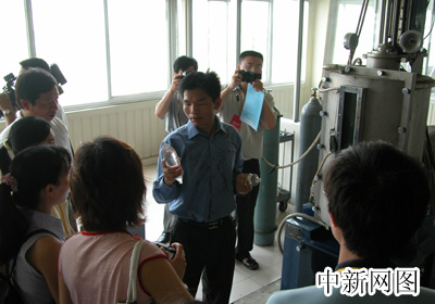 “網上河北行”采風團參觀訪問秦皇島經濟技術開發區中的華博晶體技術有限公司,該公司抓住以藍寶石為襯底材料的藍色、綠色和白色LED和LD產業快速發展契機,目前已發展為國內最大的藍寶石生產基地。圖為該公司負責人向記者們展示產品加工過程。(秦欣攝)