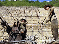 二○○四年七月仲夏,中國長江三峽地區降雨量增多,部分地區出現泥石流和山體滑坡。為防止移民新城和三峽庫岸出現類似隱患,奉節縣正抓緊時間治理沿江高邊坡工程。圖為進入伏季以來,雨后初晴之時,三峽地區奉節縣新縣城人民廣場高邊坡治理工地上,民工在暑熱中澆混泥漿。作者:周會