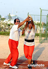 國家田徑隊女子鏈球組優秀運動員顧原(右),二○○四年七月中旬在日照山東省體院訓練基地緊張訓練,備戰雅典奧運會。圖為教練歐喜元(左)正在為顧原做技術指導。中新社記者:張勤