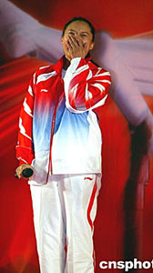 七月二十七日,即將出征雅典奧運會的射擊運動員曹英身穿“錦繡中華”領獎服,出現在李寧公司贊助二十八屆奧運會中國軍團發布會現場。李寧公司此次特為中國奧運健兒準備了“錦繡中華”領獎服等裝備。中新社記者:鄭萍萍