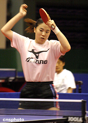 七月三十日上午,中國乒乓球女隊隊員王楠在河北正定乒乓球訓練基地對抗賽中奮力拼殺,備戰奧運會。中新社記者:張勤