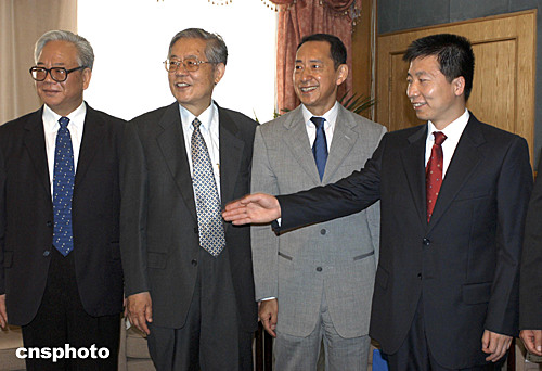 七月三十日,中國首飛航天員楊利偉(右)與日本首飛航天員毛利衛(左二),在北京中國科技會堂會面。中國科學技術協會主席周光召(左一)主持了會見儀式。中新社記者:鄒憲