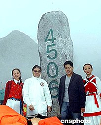 香港奧委會主席霍震霆及公子,8月1日在云南麗江游覽玉龍雪山,在海拔4506高度標志前留影。作者:洪少葵