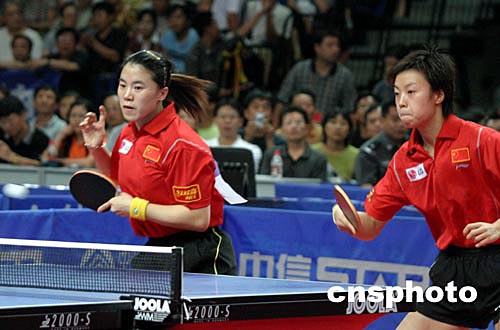 中國國家乒乓球隊出征雅典奧運會前最后一次熱身賽二○○四年八月二日至三日在河北秦皇島市奧林匹克體育館舉行,八月三日晚女子雙打決賽王楠(左)、張怡寧以四比三勝郭躍、牛劍鋒獲得第一名。中新社記者:張勤