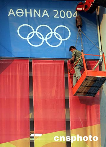 當地時間8月3日晚,一名建筑工人在雅典奧運會主體育場安裝加固旗幟,開幕式將于8月13日在這里舉行。中新社記者:任晨鳴