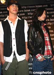 香港品牌Izzue于二○○四年八月初,兩岸三地同步推出T恤圖騰設計比賽,擔任品牌形象設計總監的香港著名影星張曼玉,八月四日參加Izzue臺灣省臺北市旗艦店舉行的記者會。作者:董會峰