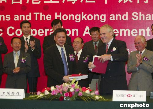 中新社北京八月六日電(記者李鵬)中國最大的股份制商業銀行交通銀行六日與香港上海匯豐銀行在北京簽署戰略合作協議。匯豐銀行以現金入股交通銀行,入股比例為百分之十九點九,接近銀監會規定的百分之二十上限,這是迄今為止國際著名金融機構入股中國商業銀行的最大宗交易。