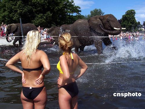 丹麥最近遭遇持續高溫天氣,動物園中的大象難耐酷熱,飼養員帶領它們來到河中沖水納涼,引來許多好奇的人們駐足觀看。作者:Ic/cnsphoto