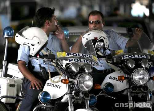 當地時間8月6日晚,兩名為奧運會貴賓開道的雅典市警察在緊張的工作后,哥倆兒小聚抽支煙解解乏。雅典奧運會開支一再超標,其中投入安保的資金巨大,所有參與的警察通過各種方式的爭取而獲得了較為豐厚的加班費。中新社記者:任晨鳴