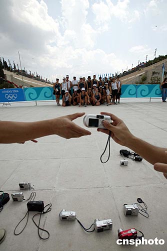 奧運大戰前夕,新西蘭女子曲棍球隊8日在著名的大雅典運動場前合影留念,十幾臺數碼照相機一字排開,使攝影師成為最忙碌的人。中新社記者:王瑤