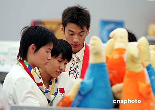 當(dāng)?shù)貢r間八月九日上午,參加雅典奧運會的中國代表團(tuán)女子游泳小將江文菁(中)等利用賽前閑暇時間,在奧運選手村逛商店,在琳瑯滿目的奧運吉祥物紀(jì)念品前駐足留連。中新社記者:毛建軍