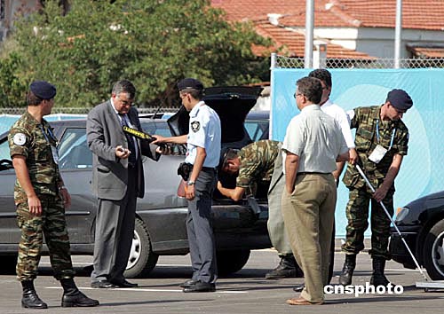 當地時間八月九日,進入希臘雅典奧運選手村的人員與車輛正接受警員的嚴格檢查,以確保安全。中新社記者:毛建軍