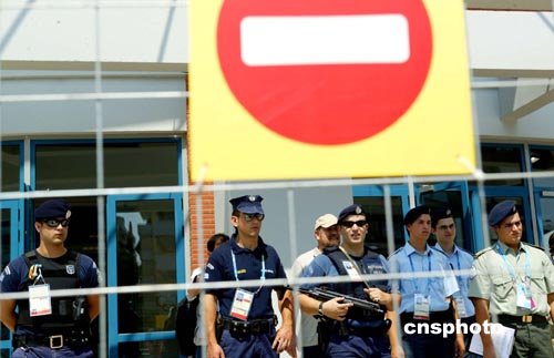當地時間八月九日在希臘雅典奧運會主新聞中心前,全副武裝的軍警一步一崗,以確保各國記者安全。中新社記者:王瑤
