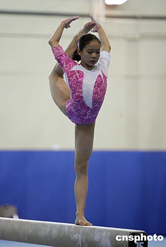 當地時間八月九日,中國女子體操隊隊員程菲在雅典奧運會體操館進行平衡木訓練。中新社記者:毛建軍