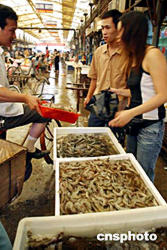 八月十日,鄭州市民在市場購買降價的鮮蝦。由于受到美國“反傾銷”調查影響,中國廣東、浙江等主要產區的蝦產品不得不大量轉為內銷,使內地市場供應量猛增,河南省蝦價已下跌三成。目前廣東、浙江很多水產品已開始將出口目標市場轉向歐盟。中新社記者:慎重