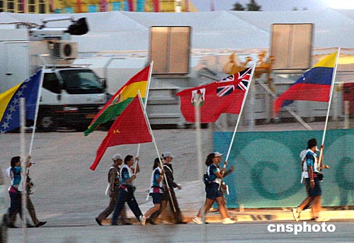 雅典時間8月10日晚,最后一次奧運開幕式彩排在雅典主體育場舉行。圖為旗手高舉各參賽代表團旗幟列隊進入體育場。中新社記者:張煒