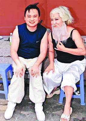 對于自己這個白衣長老的造型,薛家燕說:“本來不用粘這些胡子的,但我覺得粘上去會逼真很多,而且效果也很明顯,不過粘了上去以后你會覺得很辛苦,特別是這么熱的天氣。”雖然只是合作了幾天,但薛家燕對孔慶翔依然是贊不絕口,“他雖然是新人,但是我覺得他的演出已經是很專業和投入,他很努力,每天的對白都背得很熟。其實在這部電影里,我們不需要他有特別的演出,只要做本能的演出就可以了,例如你們剛才看到的,召喚飛鳥來救我他只需在旁邊鼓掌就行了,而那些動作武打戲份就讓我和恬妞去分擔,我希望大家可以給點時間讓他去磨練。”薛家燕對他的演出打了一個80分,欠缺的20分她認為應該是外界看了這部片以后給的。