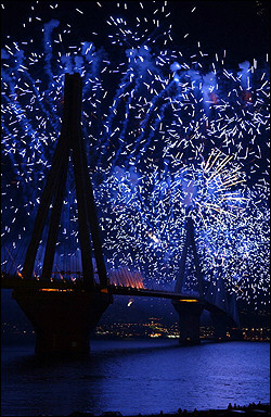 中新網8月11日電 據法新社消息,在雅典奧運到來之前,雅典已經開始著各項慶祝儀式。圖為雅典Rio-Antirio大橋上的煙花匯演。
