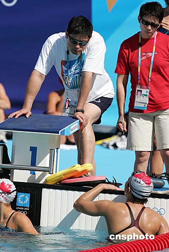 當地時間八月十一日上午,中國游泳隊教頭趙戈在雅典奧運比賽場指導隊員進行熱身訓練。中新社記者:毛建軍