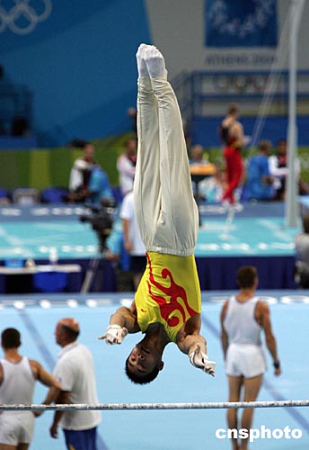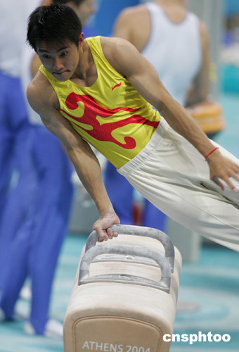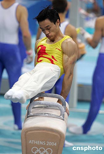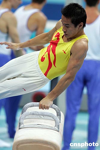 中國男子體操隊(duì)當(dāng)?shù)貢r(shí)間八月十一日晚上在雅典奧運(yùn)體操比賽館與德國、日本、烏克蘭隊(duì)進(jìn)行集體合練。中新社記者:毛建軍
