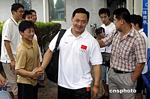 八月十二日,中國(guó)舉重隊(duì)著名選手占旭剛(中)在中國(guó)國(guó)家體育總局訓(xùn)練局與隊(duì)友們告別奔赴雅典,這是中國(guó)舉重隊(duì)第二批隊(duì)員出征雅典奧運(yùn)會(huì)。中新社記者:盛佳鵬