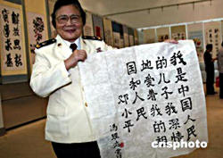 “‘小平同志告訴我們’中國當代名人書法大展”八月十二日在北京舉行,各界人士書寫的三百幅以鄧小平名句為內容的書法作品與世人見面。馮玉祥將軍之女、女少將、海軍總醫院原副院長馮理達展示自己書寫的鄧小平名句。中新社記者:滿會喬