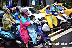 臺風(fēng)“云娜”八月十二日掠過北臺灣,給臺北市帶來風(fēng)和雨。圖為騎摩托車的民眾身穿雨衣抵擋風(fēng)雨。中新社記者:董會峰