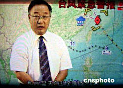 中國氣象局局長秦大河八月十二日在中央電視臺黃金時間的天氣預報節(jié)目上首次亮相,發(fā)布中國大部分地區(qū)即將出現(xiàn)臺風和暴雨的緊急警報,同時顯示紅色的中國地質(zhì)災害警報。中新社記者:賈國榮