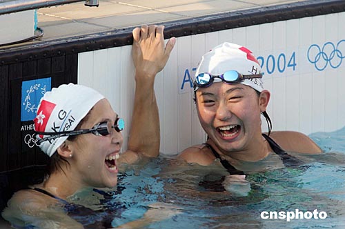 香港奧運游泳選手當地時間八月十二日在雅典奧運游泳比賽場進行賽前訓練,心情愉快。中新社記者:毛建軍