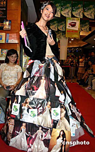 位于臺北市華納威秀影城二樓的何嘉仁書店八月十三日首辦時裝秀。圖為知名藝人賈欣惠身著用流行雜志制成的時裝走秀。作者:董會峰