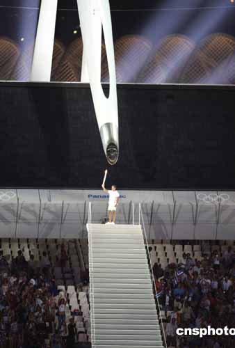 雅典時間十四日零點零五分,希臘的帆船世界冠軍科納馬納斯基手持火炬來到圣火臺,此時“針鼻”形的主火炬被慢慢放倒,科納馬納斯基用手中的小火炬點燃了主火炬后,主火炬又緩緩升到原來的高度。舉世矚目的二00四年雅典奧運會火炬點燃儀式就此揭開了神秘面紗。