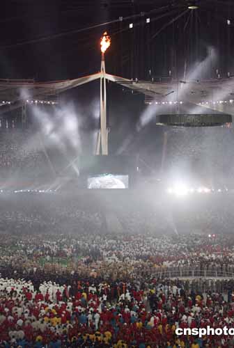 雅典奧運會主體育場的熊熊圣火將伴隨各國運動健兒參加庫期十六天的各項比賽。