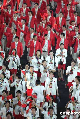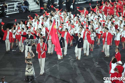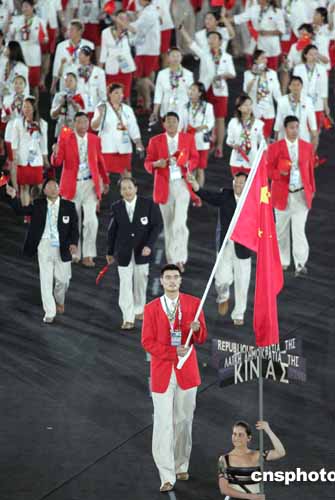 當地時間八月十三日晚,第二十八屆奧運會在希臘雅典開幕。圖為中國體育代表團以龐大陣容進入會場。中新社記者:毛建軍