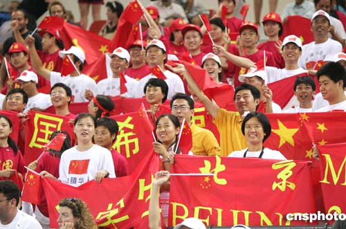 當(dāng)?shù)貢r(shí)間八月十四日,第二十八屆奧運(yùn)會(huì)女籃比賽拉開戰(zhàn)幕,中國女籃在雅典赫利尼科籃球館首戰(zhàn)韓國以七十一比五十四獲得勝利。圖為中國啦啦隊(duì)在賽場(chǎng)為女籃姑娘們吶喊助威。中新社記者:毛建軍