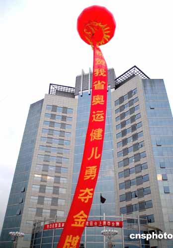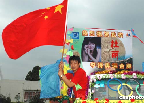 在八月十四日下午結(jié)束的雅典奧運(yùn)會(huì)女子十米氣步槍決賽中,山東女射擊運(yùn)動(dòng)員杜麗奪得本屆奧運(yùn)會(huì)首枚金牌。杜麗的母校山東省競(jìng)技體育運(yùn)動(dòng)學(xué)校的師生扎制彩車(chē)在濟(jì)南街頭游行慶祝。作者:宋衛(wèi)東