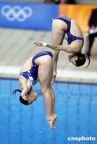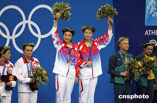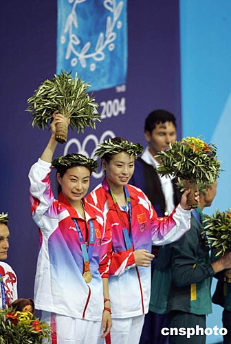 當地時間八月十四日晚,郭晶晶與吳敏霞在雅典奧運跳水館獲得第二十八屆奧運會女子三米板雙人金牌。中新社記者:毛建軍