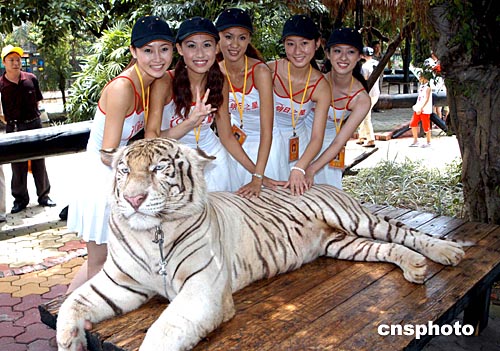 八月十五日,第五屆明日之星影視新星的入選選手來到廣州番禺香江野生動物世界拍攝外景。圖為美女與白老虎合影。作者:劉衛勇
