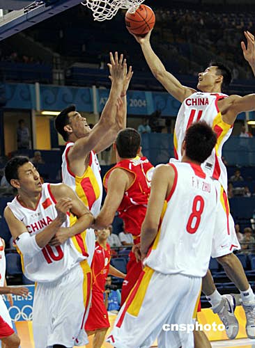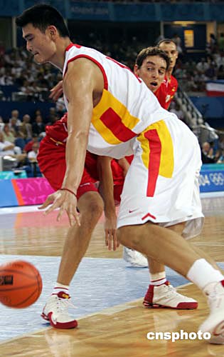 中新社雅典八月十五日電(記者 王祖敏)當(dāng)?shù)貢r間今天下午,中國男籃在奧運(yùn)會小組賽的首戰(zhàn)中,以五十八比八十三慘敗于西班牙隊(duì),小巨人姚明上場二十七分鐘獲得十二分,在第四節(jié)因?yàn)榉敢?guī)累計(jì)達(dá)到五次被罰下,而西班牙球星加索爾獲得全場最高的二十一分。