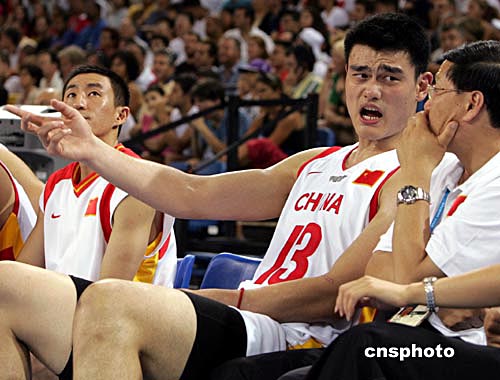 愈戰(zhàn)愈勇的西班牙隊(duì)在最后一節(jié)比賽中依然延續(xù)了瘋狂的進(jìn)攻,將比分差距進(jìn)一步擴(kuò)大。中國隊(duì)換上巴特爾和姚明雙塔,但場上形勢仍無改觀,在比賽還剩下最后四分鐘時,加索爾又一次在姚明頭上扣籃,裁判判姚明阻擋犯規(guī),五次犯規(guī)的姚明無奈地走出場外。徹底失去希望的中國隊(duì)最終以五十八比八十三告負(fù)。