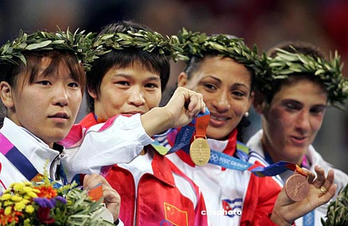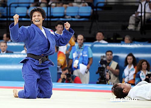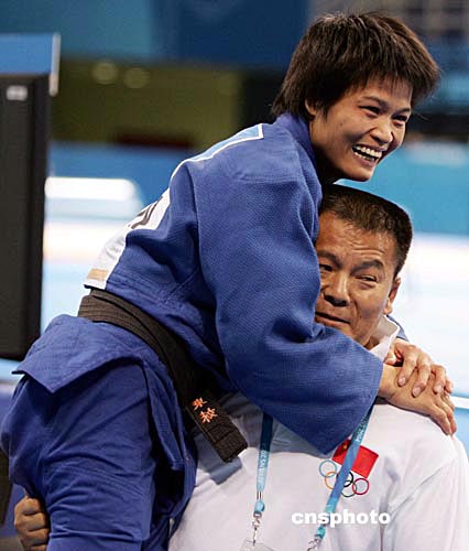 當地時間八月十五日,在雅典舉行的第二十八屆奧運會女子五十二公斤級比賽中,中國選手冼東妹戰勝日本選手橫澤由貴獲得金牌。中新社記者:毛建軍
